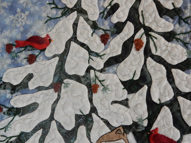 ReplyDeleteIt seems to be as I slowly look at each photo what an astonishing piece of art each block is. I can only imagine how amazing this quilt will look in all it's entirety. The quilting has added even more beauty and lovely character to it. Machines and the tension!! Sometimes they do fight each other, don't they. I don't think I would even notice those parts where you are unhappy with the tension. I only see astounding beauty. This quilt is one where every embroidered ribbon, every applique....indeed every stitch is filled with love. I cannot wait to see this beautiful quilt when the last stitch has been stitched!